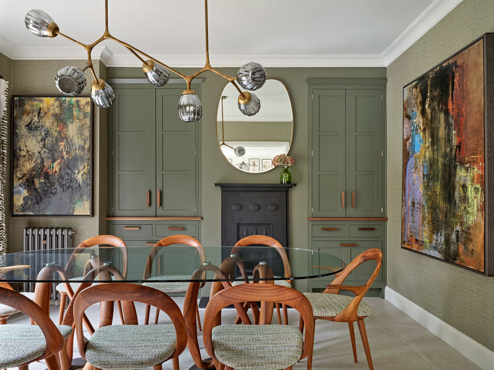 This early 1900's detached house in Surrey has been beautifully refurbished to provide all the modern requirements and comforts of modern living, in sympathy with its original style from the Arts and Crafts period. Keeping all the original features such as the heavy panelling and strong use of carved woods throughout, we have introduced rich and warm colour schemes and an eclectic mix of furnishings to give the house an individual feel.